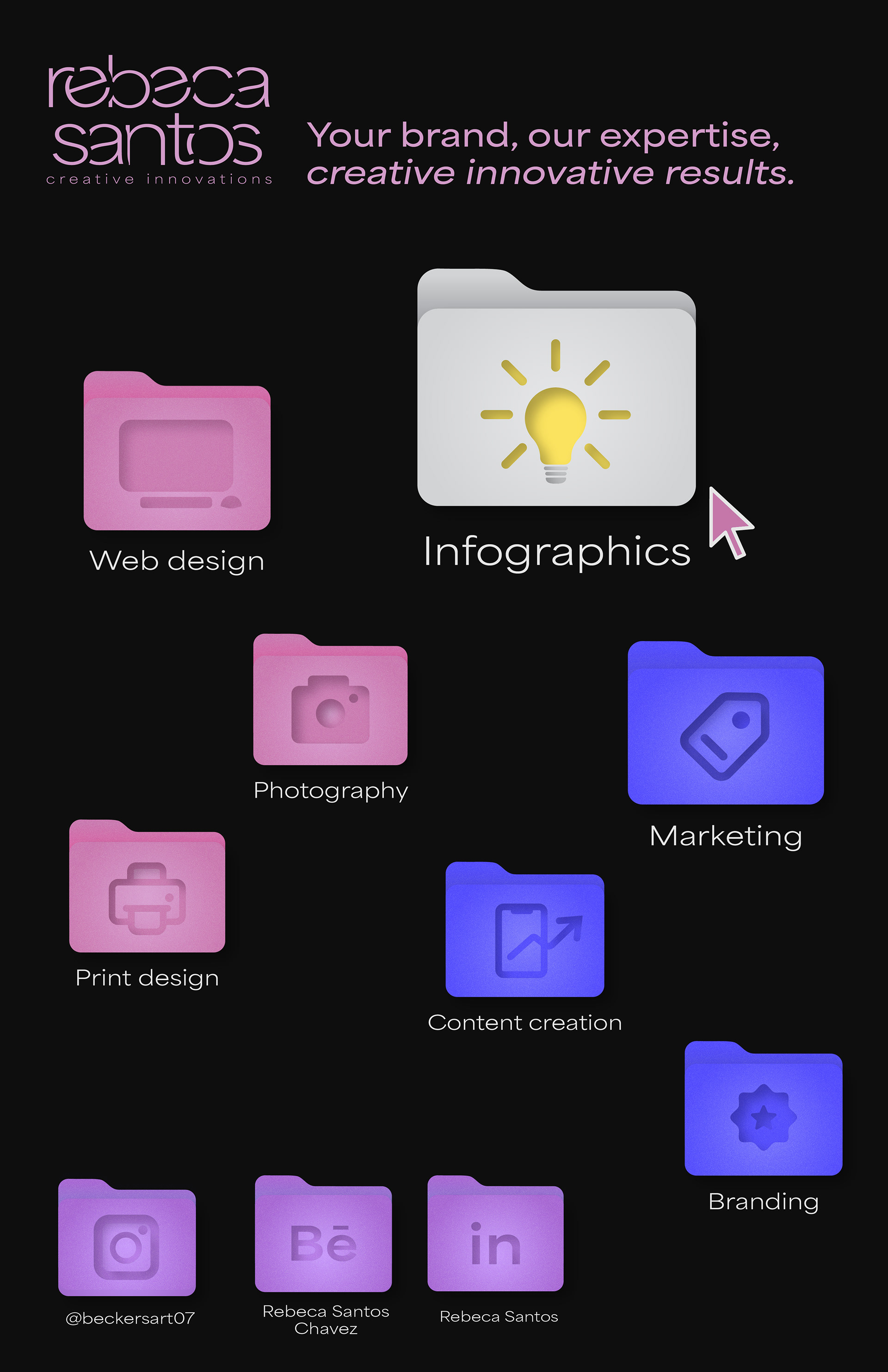 Welcome to the Creative Innovations studio! I am Rebeca Santos, a Mexican Visual Communications Designer that specializes in Data Visualization Design, Web Design, Marketing, Print Design, and Branding.